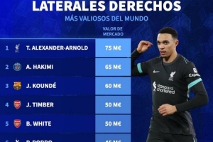 体育资讯3月28日讯 媒体盛传,阿诺德即将自由身转会加盟皇马。德国转会市场今日列出右后卫球员身价排名,阿诺德7500万欧元第一。